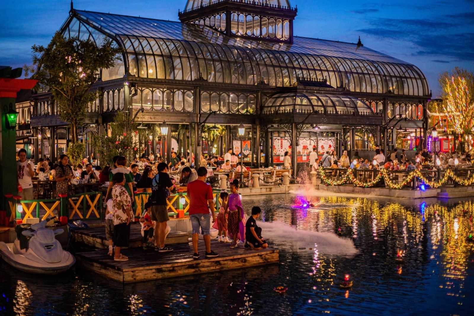 整個園區被打造成歐風小鎮:風車、燈塔、鐘樓、小橋流水、天使雕像等;園區內也裝設許多路燈,