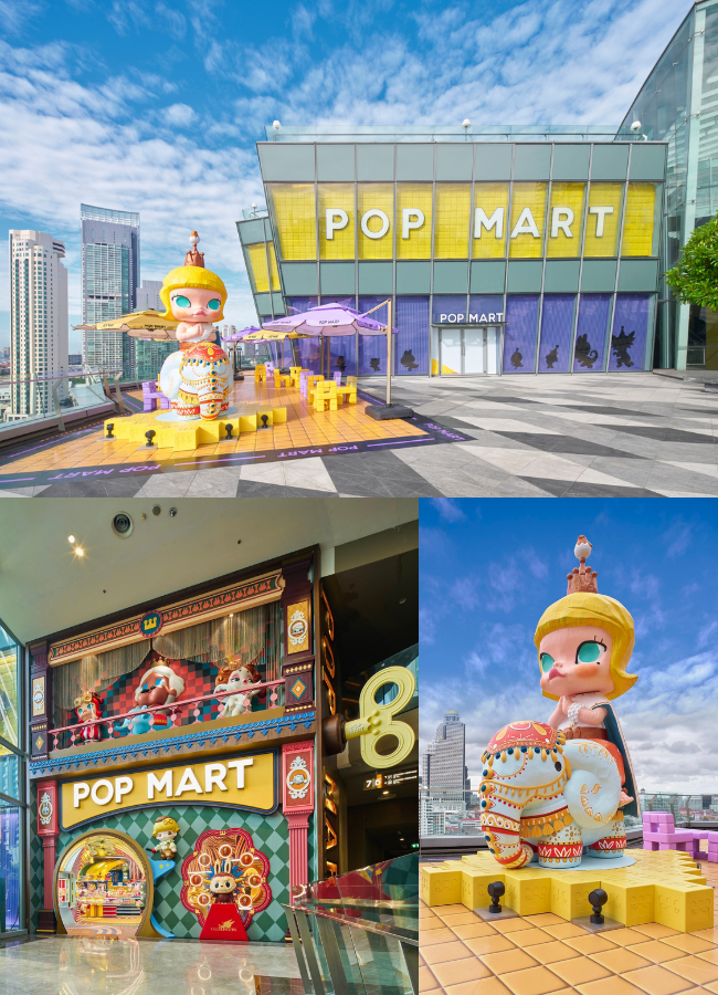 在河畔矗立的 ICON SIAM 百貨公司,POP MART 全球旗艦店正式登場!設計巧妙融合泰國文化、傳統建築與包容性的理念,曲線與圓形元素流動交織,宛如昭披耶河的柔波在空間中律動。入口處由 Crybaby 騎象的兩層上鍊玩具造型迎賓,而室外河景露台則矗立著 4 公尺高、身著傳統服飾的 Molly 巨型雕像,既具代表性又溫暖。