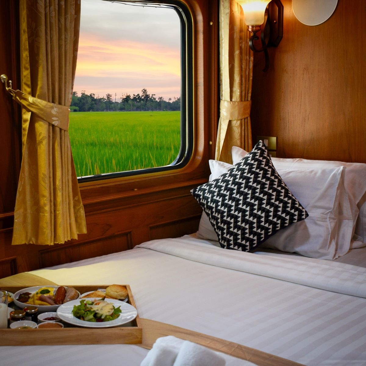 列車提供多種房型,從經典艙到寬敞的豪華套房,每一個空間都能感受到細膩的匠心。寬大的床鋪、私人浴室與窗外不斷變換的泰國風景,使旅客在移動中也能享受飯店級的舒適。夜晚,當列車穿越鄉野稻田,房間裡瀰漫的安靜與搖晃節奏更是擁有獨特魅力。