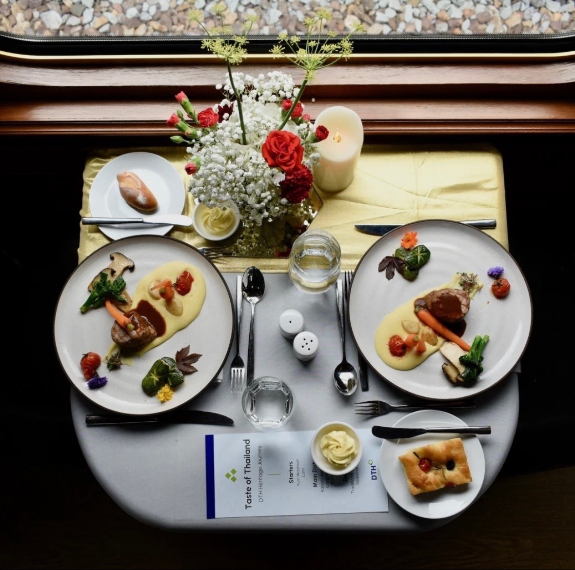 The Blue Jasmine 最受讚譽的亮點之一,就是由泰國名廚團隊設計的鐵道料理。餐廳車廂柔和金光映照,呈現出曼谷高級餐廳的品味。旅客能品嚐到以在地食材打造的創意泰菜。