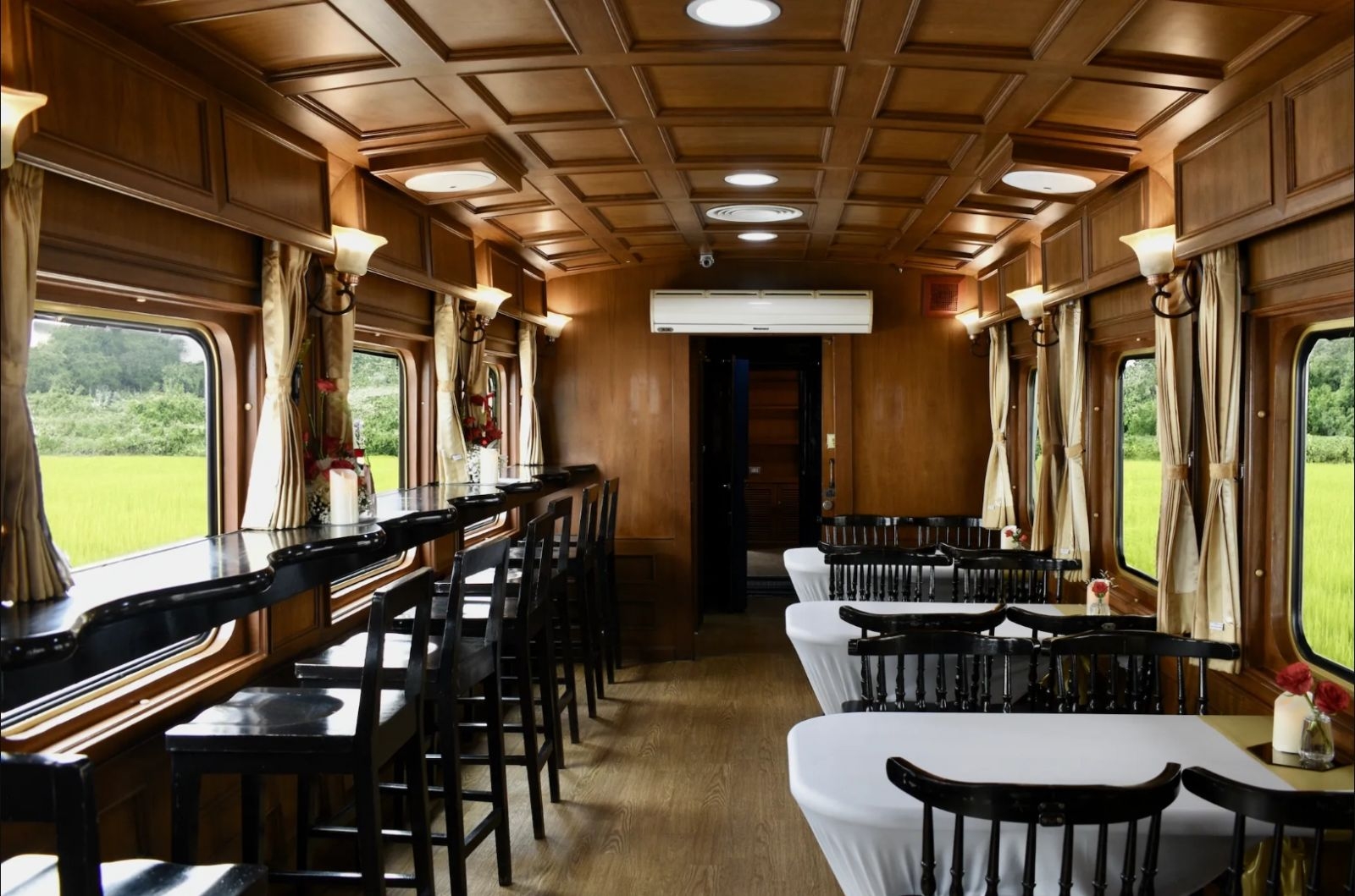 踏上 The Blue Jasmine 的第一步,就像步入一座流動的宮殿。車身採用優雅的藍色與金色線條,外觀低調中帶著王室氣派。車廂內部則融合泰式傳統花紋與現代簡約美學,木質細節與絲質織品營造出溫暖而奢華的氛圍。